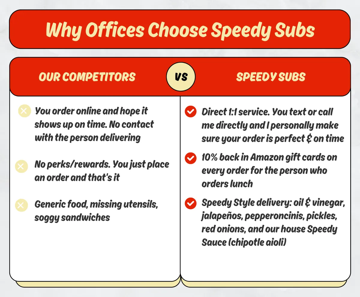 After running a record-setting pizzeria, I saw firsthand how great food brings offices together. Today, I deliver Utah’s best sandwiches for office lunches—with one simple goal: make your team love lunch and reward you on every order.